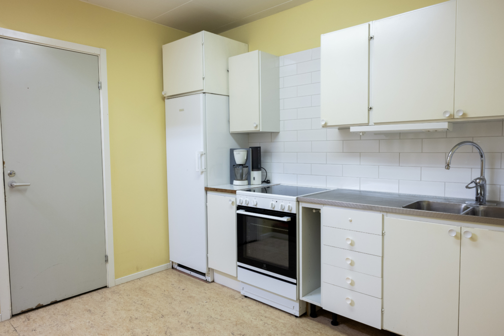 Kvarterslokal Hatten: kök med spis, ugn, kyl och disko