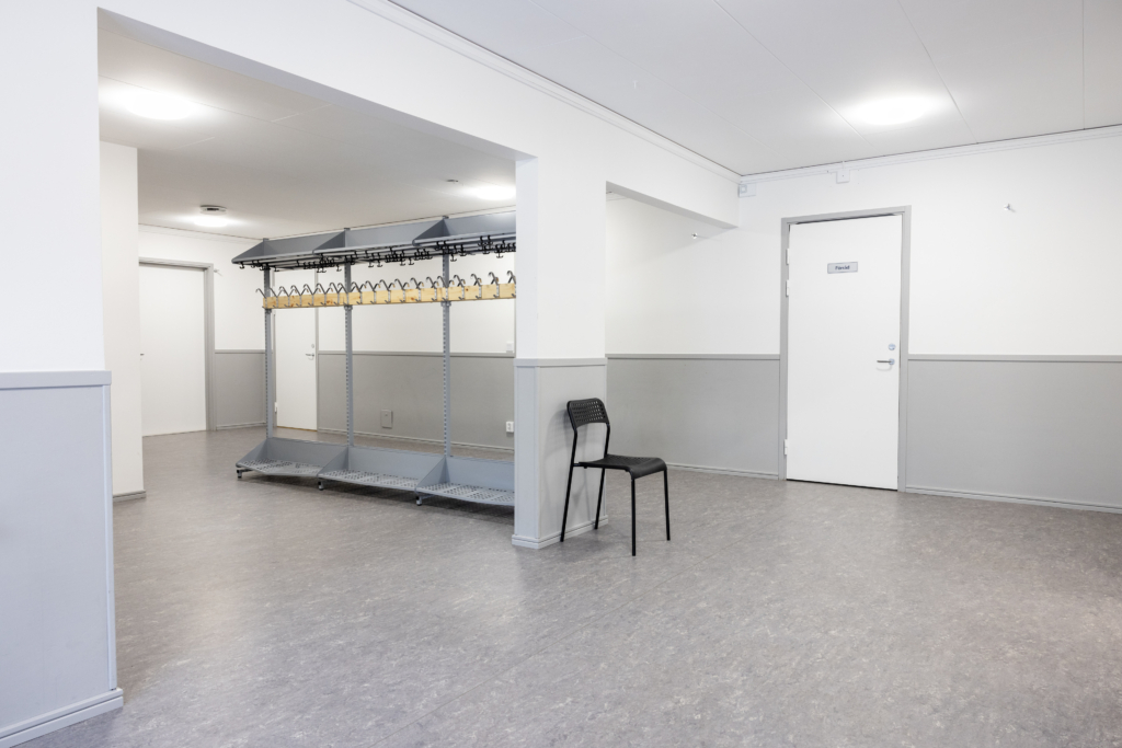 Kvarterslokal Nocken: kapprum med klädställning och dörr till förrådet.