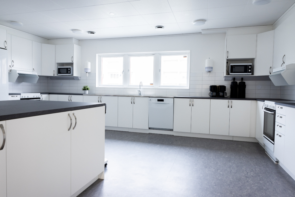 Stort kök med diskmaskin, kylar, frysar, mikro, kaffebryggare samt spis och två stycken WC. Städutrustning finns.