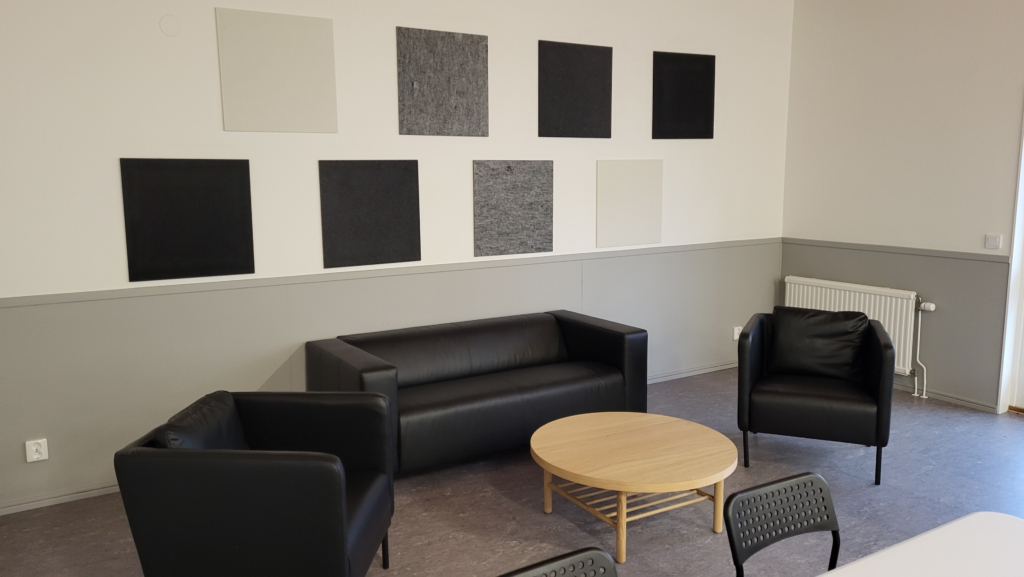 Kvarterslokal Nocken: Allrum med svarta lädermöbler och ljudabsorbenter på väggen