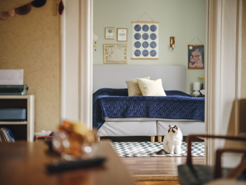 En katt som sitter på mattan i ett sovrum.