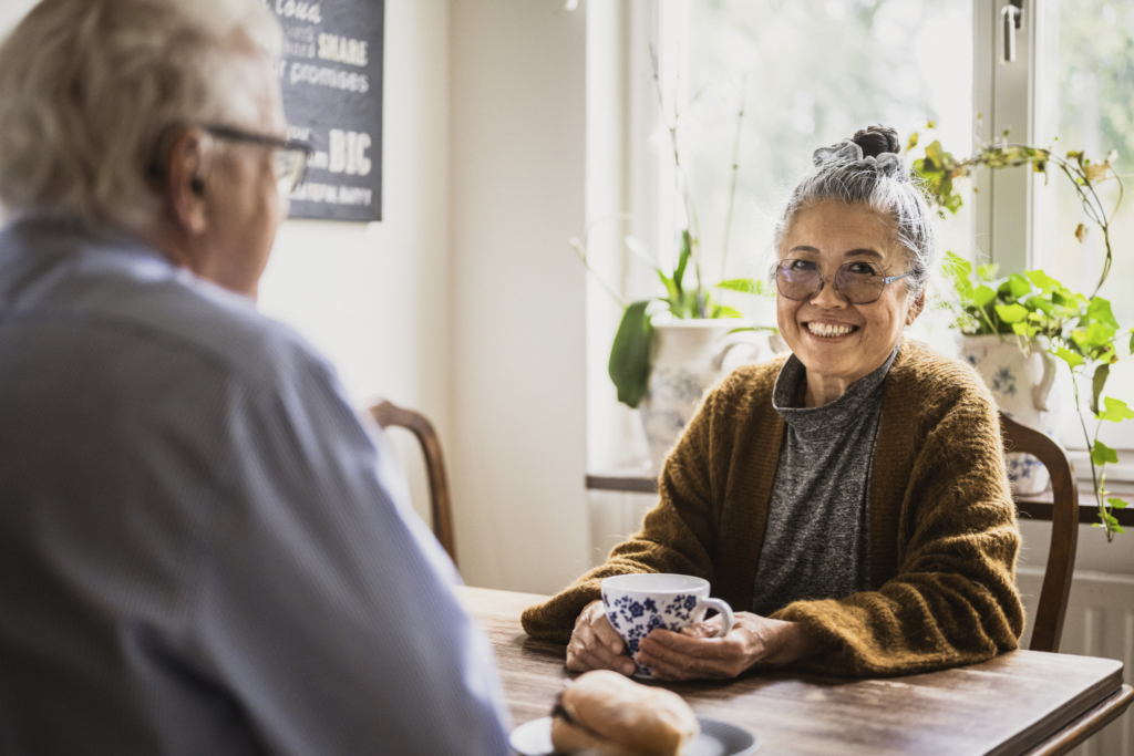 Ett äldre par sitter i ett kök och fikar. Kvinnan ler mot kameran.