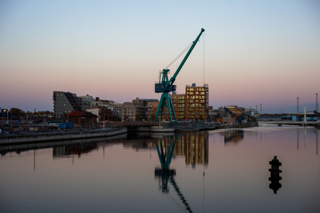 Överblicksbild av Inre hamnen: en kran som står intill vattnet med bostäder i bakgrunden.