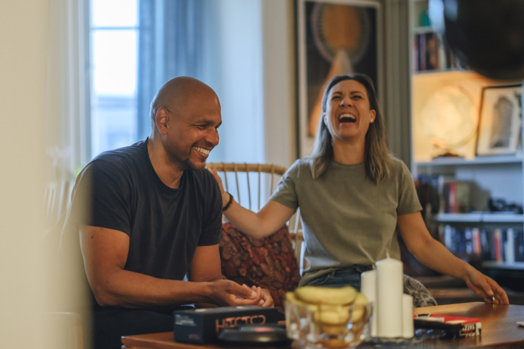 En man och en kvinna sitter vid ett vardagsrumsbord och spelar spel tillsammans.