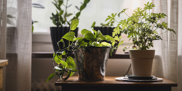 Ett träbord med krukväxter bredvid ett fönster.