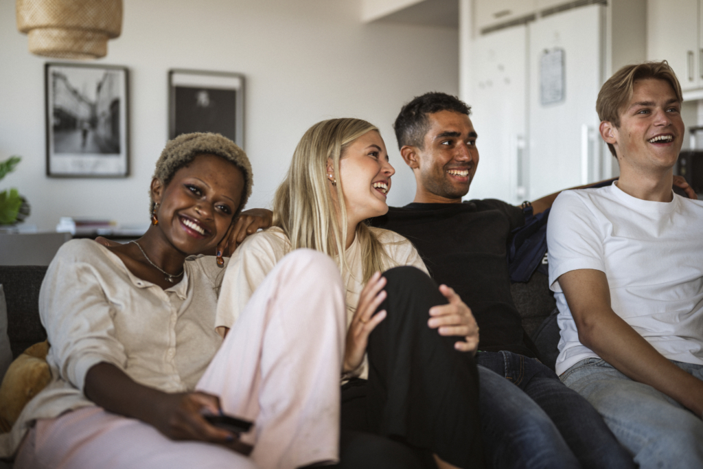En grupp med ungdomar sitter i en soffa tillsammans.